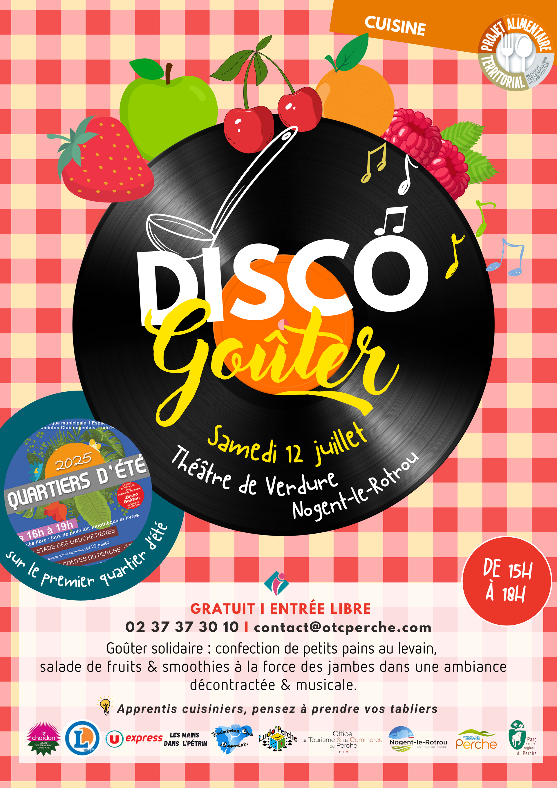 Pour le premier quartier d’été, au théâtre de verdure, c’est disco-goûter : un rendez-vous proposé par l'office du tourisme de Nogent-le-Rotrou pour cuisiner en groupe et bien manger dans une ambiance décontractée et musicale. Confection de petits pains au levain avec les Mains dans l’pétrin (façonnage et cuisson au four à bois), salade de fruits & smoothie avec des rebuts ou invendus du Chardon, et autres boutiques alimentaires de la ville, et le vélo à jus d’Oxygem 28. Gratuit I Entrée libre