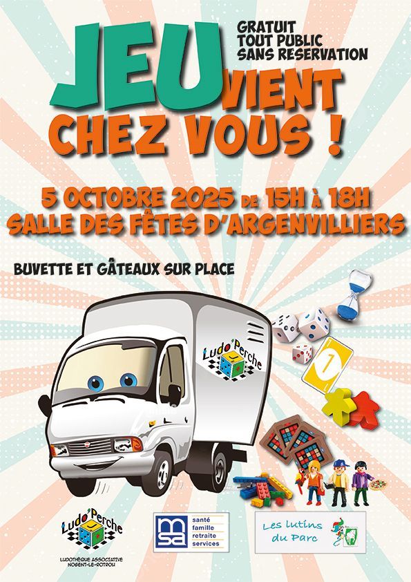 On remplit le camion pour vous proposer une ludothèque éphémère au plus proche de chez vous , pour les grands et les petits : jeux géants, coin petite enfance, jeux de société et espace symbolique pour s'amuser ensemble. L'association les Lutins du Perche vous proposera une buvette et des gâteaux pour votre goûter. Rendez-vous le dimanche 5 Octobre à la Salle des fêtes d'Argenvilliers de 15h00 à 18h00. L'évènement est gratuit, ouvert à tous les publics, et sans réservation.